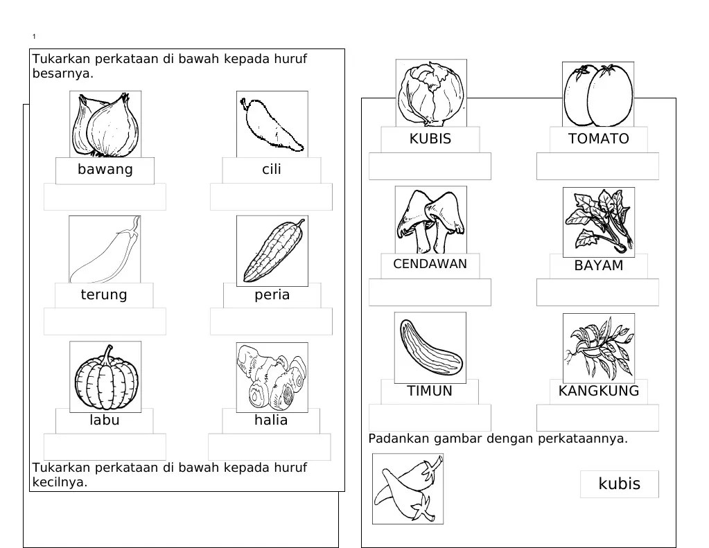 You can do the exercises online or download the worksheet as pdf. Pilih dan tuliskan nama sayur berpandukan gambar dan pilihan Pilih dan tuliskan nama sayur berpandukan gambar dan pilihan. Labu lulu bawa labu 2. Cili mama beli cili 3.